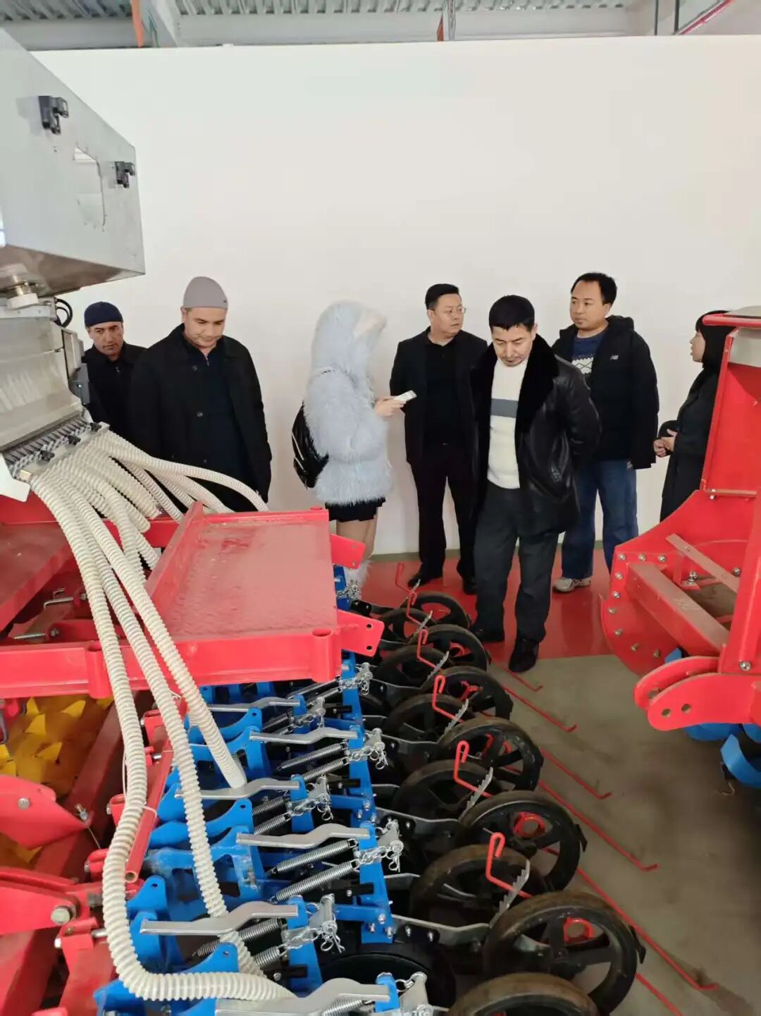 在產(chǎn)品展廳,亞澳農(nóng)機(jī)負(fù)責(zé)外貿(mào)的時(shí)馳經(jīng)理詳細(xì)介紹了公司的核心技術(shù)與產(chǎn)品優(yōu)勢(shì)。針對(duì)代表團(tuán)關(guān)注的氣吸式播種機(jī),重點(diǎn)演示了其核心優(yōu)勢(shì):搭載進(jìn)口指夾式排種器,播種精度高達(dá)95%以上,遠(yuǎn)超國(guó)家標(biāo)準(zhǔn);創(chuàng)新采用梯堵裝置等專利技術(shù),可實(shí)現(xiàn)旋耕、整地、播種、施肥一體化作業(yè),適配干旱與黏濕等多種土壤環(huán)境,且能根據(jù)需求定制雙苗帶機(jī)型,完全契合烏茲別克斯坦的棉花種植需求。“我們的產(chǎn)品在國(guó)內(nèi)小麥、玉米主產(chǎn)區(qū)可實(shí)現(xiàn)畝均增產(chǎn)10%-15%,作業(yè)成本降低30%以上,相信在烏茲別克斯坦也能發(fā)揮同樣的效益?!睍r(shí)馳經(jīng)理的介紹讓代表團(tuán)成員頻頻點(diǎn)頭。